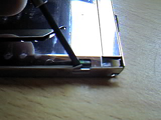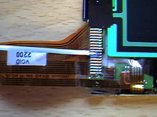 A common fault occurred with my Psion 5mx today which had me very worried as I hadn't taken a backup for a couple of days and I'd done a lot of work on it. Despite faultless use earlier in the day I flipped open the Psion to find horizontal lines staring at me on the screen. This problem happens when the flexible plastic ribbon cable which connects the motherboard to the screen cracks. A hole in the plastic which is used during the manufacturing process to hold the cable in place is a weak spot and years of flipping the Psion open and closed causes a fracture around this hole. As soon as the fracture cuts through one of the signal conductors, you can kiss your Psion display goodbye.
