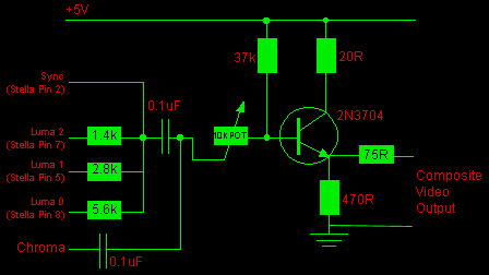 Picking up Luma 0 from Stella pin 6 rather than pin 8 and using the transistor amplifier as described above works for me. If all this has put you off then you don't necessarily need to go out and buy an expensive RF to composite converter - just try and track down someone with an old worn-out VCR which doesn't play tapes any more. Stop them from throwing it into the trash and you can use it as a signal converter. All you have to do is connect the RF output of the Atari into the aerial input of the VCR, tune in the VCR to the Atari's frequency and then connect the composite output of the VCR to the TV. It's not ideal as you're converting the digital Atari signals to analogue and then back again, but it will work.