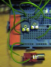 My breadboard amplifier circuit connected to the Atari is shown above. The composite video output of all these mods is sent down the pin of a Phono (RCA) connector with the shield of the connector connected to ground (0v). The signal cable at the bottom of the picture is going off to a composite video monitor. There are a lot of resistors on my breadboard (more than in the circuit diagram) because I connected some in parallel in order to lower values and some in series in order to increase values (all part of the tweaking process). The values quoted in the circuit diagram are the best compromise I found.