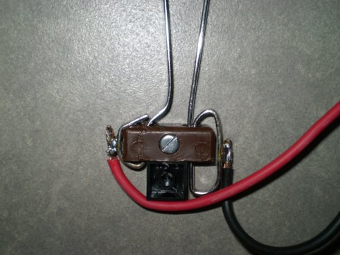 This close up shows some later work on the electrode base. I wanted to use some kind of physical connection to attach the wires but didn't have anything to hand. In the picture some rough solder joints are being used so that testing can take place during construction. These joints were later cleaned up with some proper soldering. Notice the black cube at the bottom of the modesty block. This is acting as an insulator to prevent a spark forming at the bottom on the underside of the block. This shouldn't happen as the arc will always take the easiest path between the electrodes which in this case is the <1cm gap above the block, however if one of the electrodes got bent or moved an arc can form on the underside if the gap shrinks too much. This did happen with my prototype in testing, the result being a rather burned modesty block and a bad smell. The black cube is a Lego brick I nicked from the kids' bedroom and is glued in place providing a physical insulator on the underside of the block.
