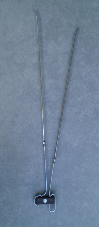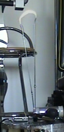 The above pic shows the modesty block shonkily bolted to the tile. Only one hole has been drilled at this point. The shape of the vee and outward curl at the top to break the arc is clear to see. The twists part way down each skewar is just the way the skewars were made and weren't put in by me. In fact you can see the poor quality of my metalwork skills in the frankly amateurish way the bottom ends of the skewars have been pulled out of the loop shape they were in and folded back on themselves around the modesty block so that the vee holds its shape. The arc has a mechanical effect on the electrodes and will push them apart as it travels so it is important that they are secured and that the vee retains its shape along its full length. The modesty block holds the electrodes a few milimetres above the tile surface so they are not resting on the tile itself. Notice that one of my electrodes is shorter than the other. I'm not sure why I made it end up like that - I think I just got it to a point where it was working and I couldn't be bothered to fiddle with the shape of the vee any further.